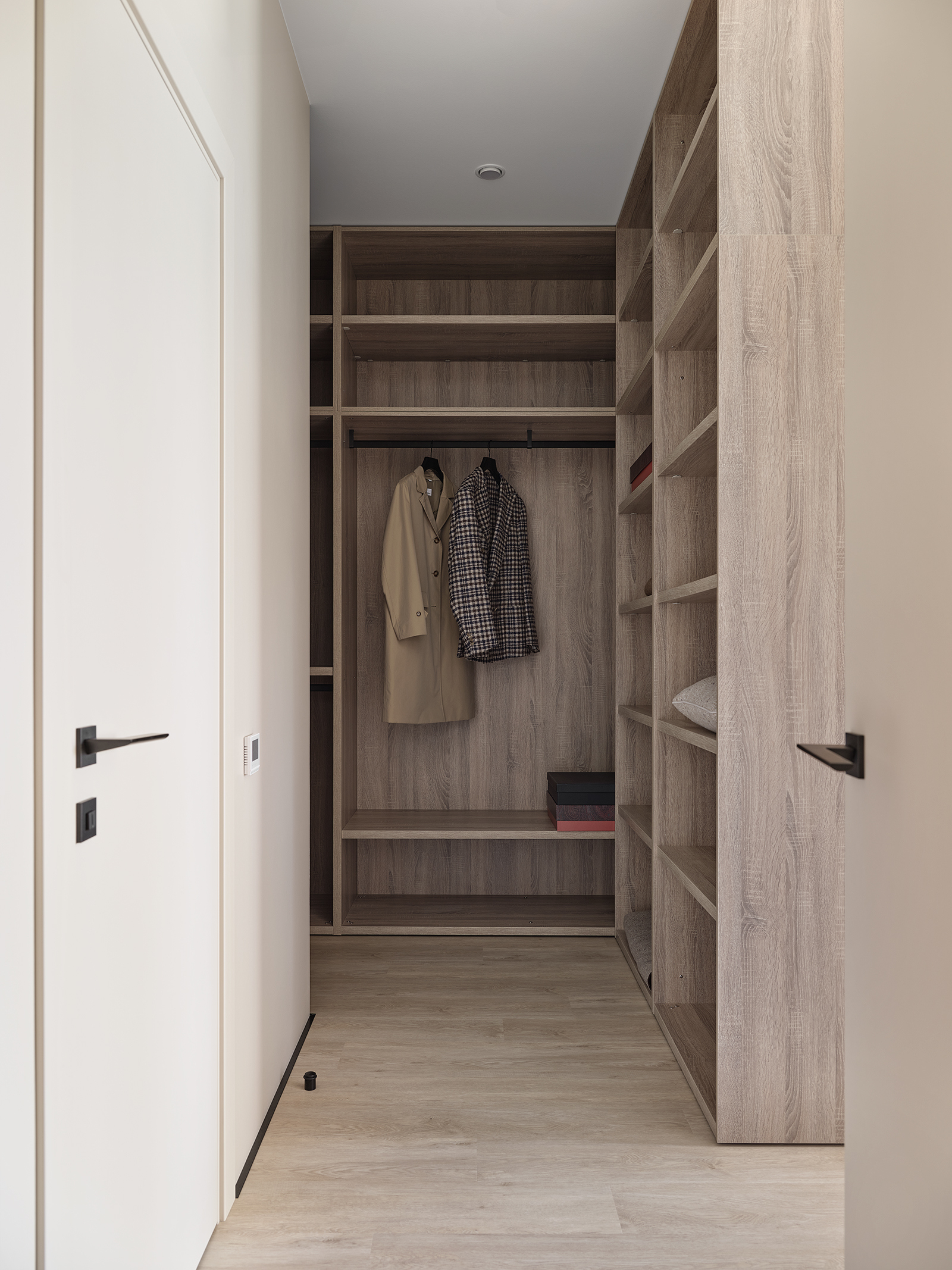 The original plan had a small alcove for the walk-in closet in the bedroom, but we opted to expand the closet into the bedroom space. We divided the walk-in closet and the bedroom with just a closet, without a partition, which saved valuable space in the room. From the bedroom side, this closet appears as wall panels.