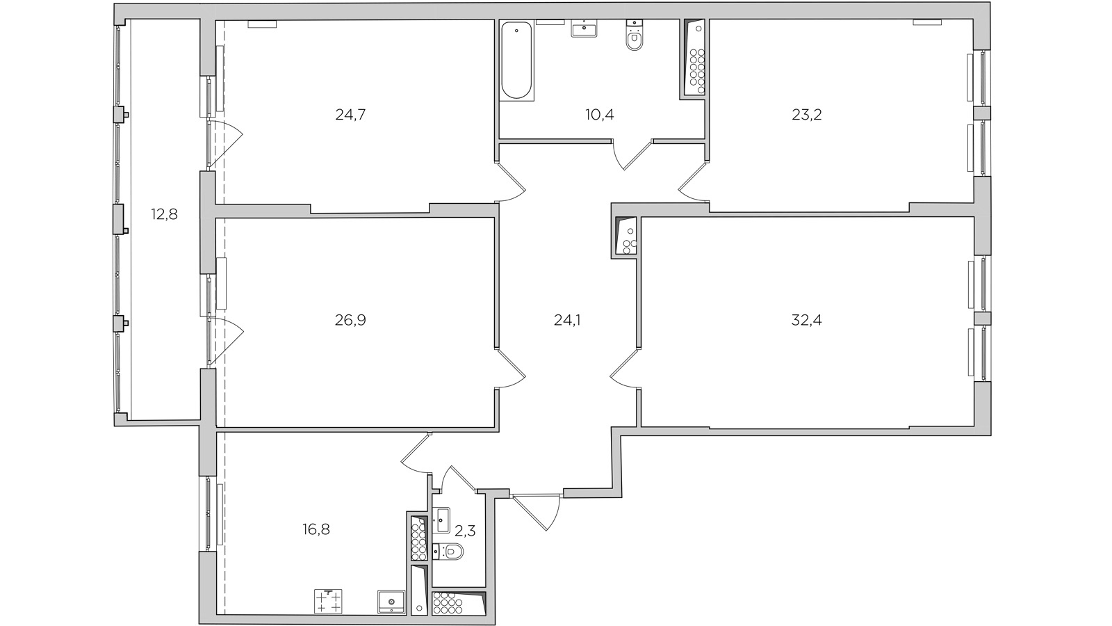 Проходная прихожая, крохотный гостевой санузел, обособленные кухня и гостиная, большой коридор, несущие пилоны, формирующие спальни |
