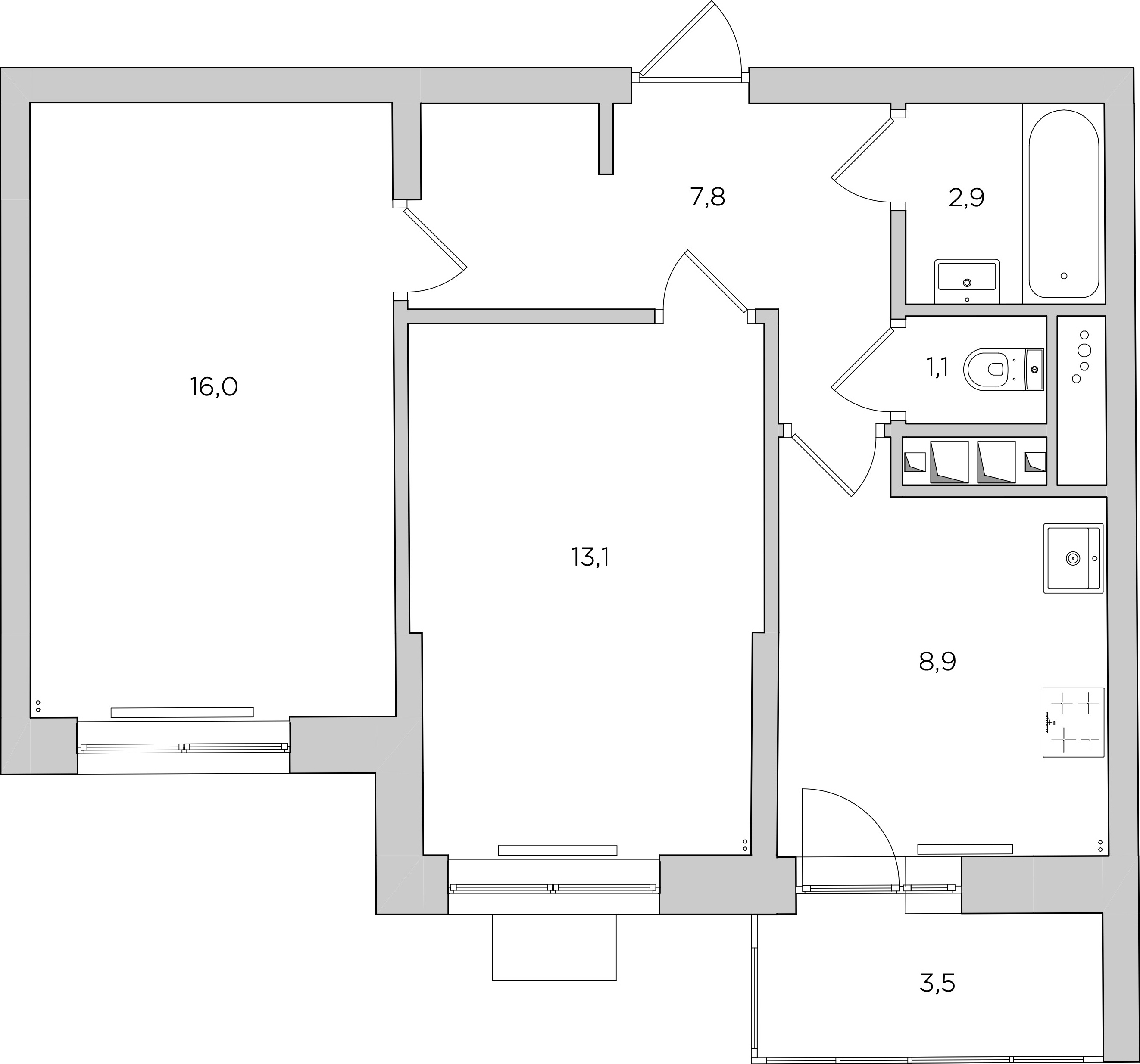 | Особенности | Несущие пилоны между комнатами, маленькая кухня, большая проходная прихожая |
