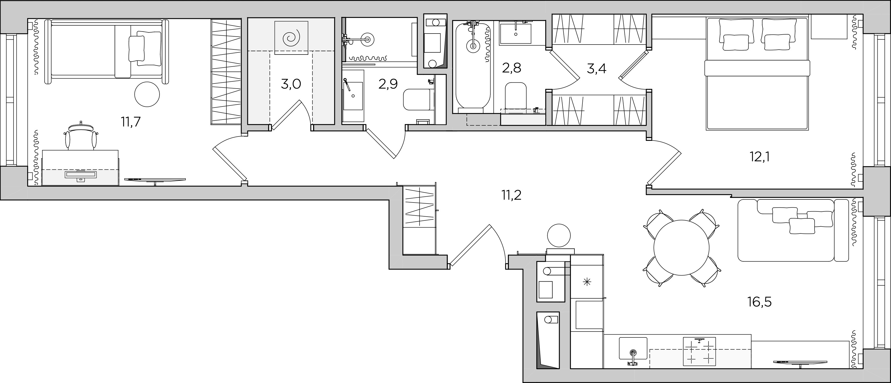 Наши заказчики — семейная пара с сыном-подростком — попросили нас сделать темный обволакивающий интерьер. Для них было важно спланировать пространство для совместных вечеров и сделать обособленную прачечную. Также родители просили нас сделать при спальне гардеробную и ванную, и у нас это получилось после перепланировки.