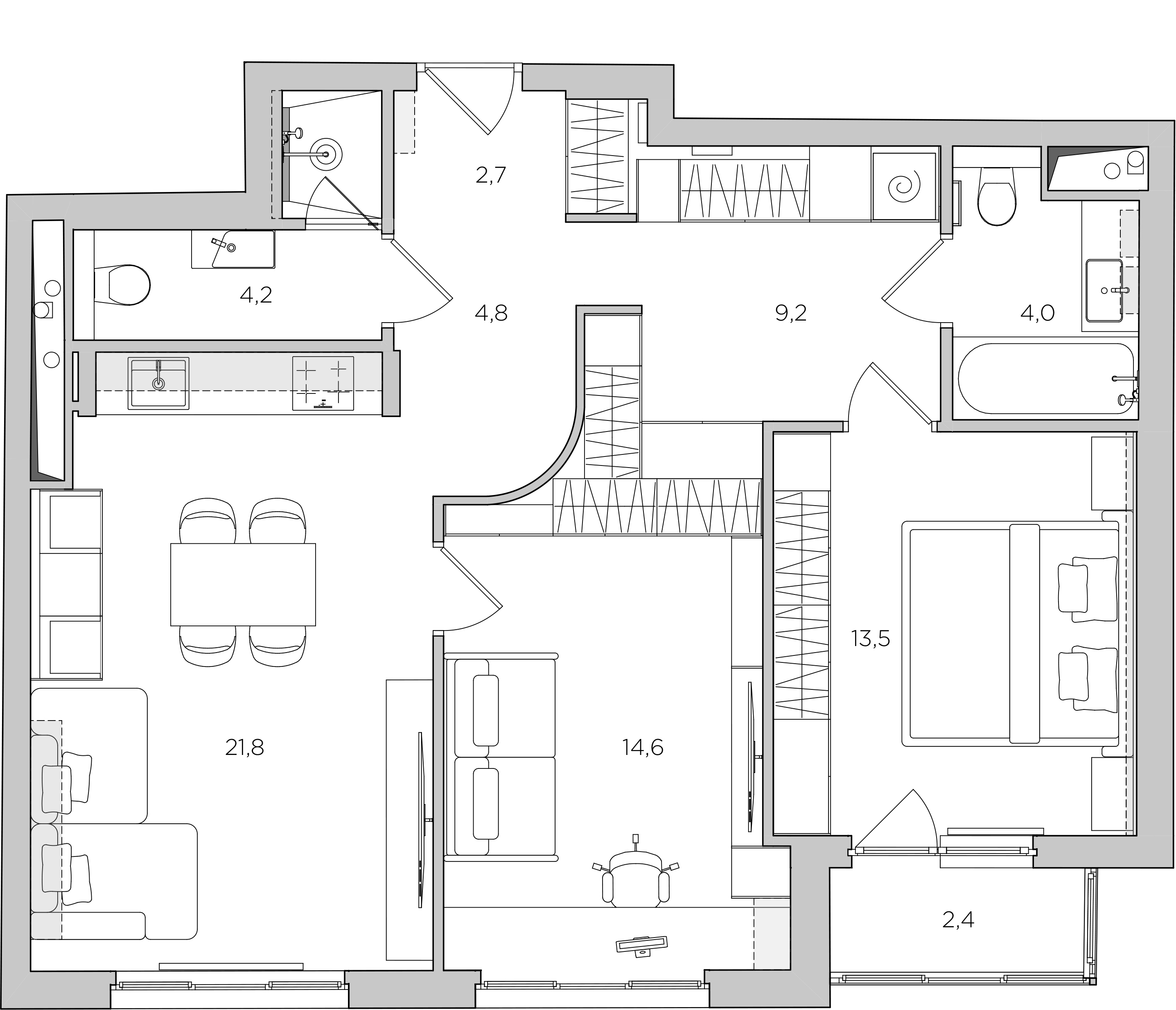 Хозяева этой квартиры хотели сделать кухню-гостиную и кабинет, который в будущем трансформировался бы в детскую, а также организовать много мест для хранения.