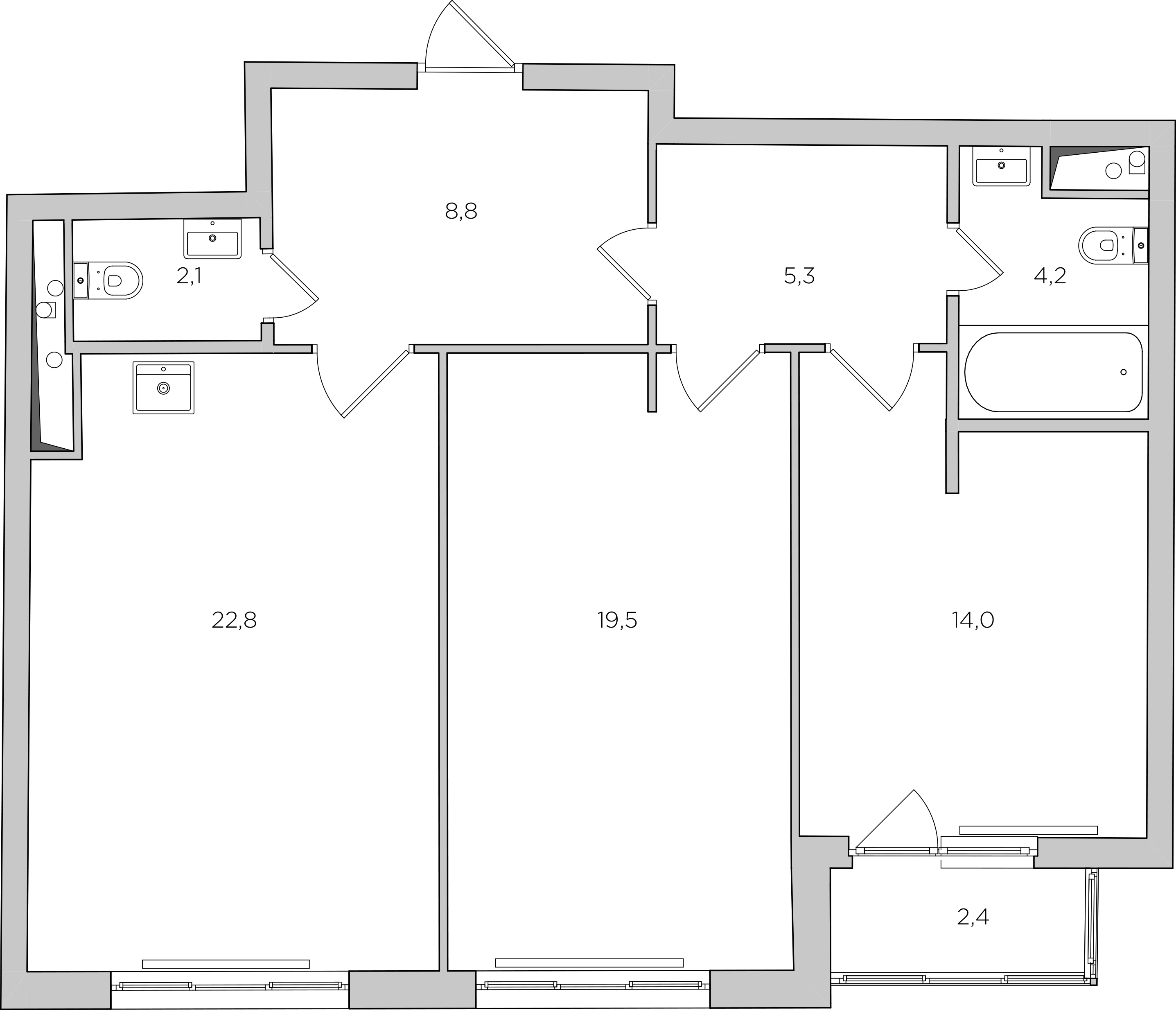 | Особенности | Небольшой гостевой санузел, нефункциональный коридор, большие окна на солнечной стороне, нет несущих стен |
