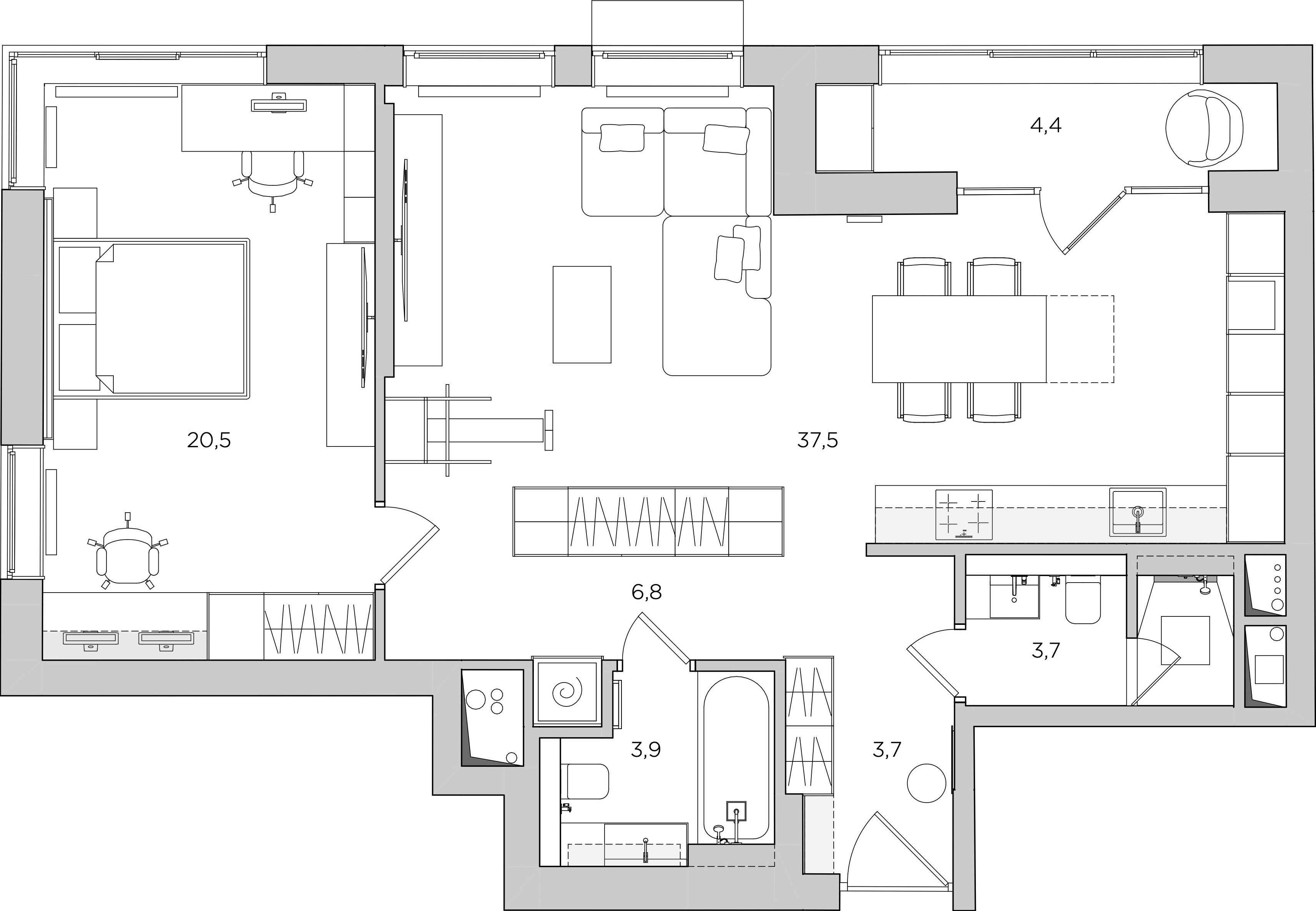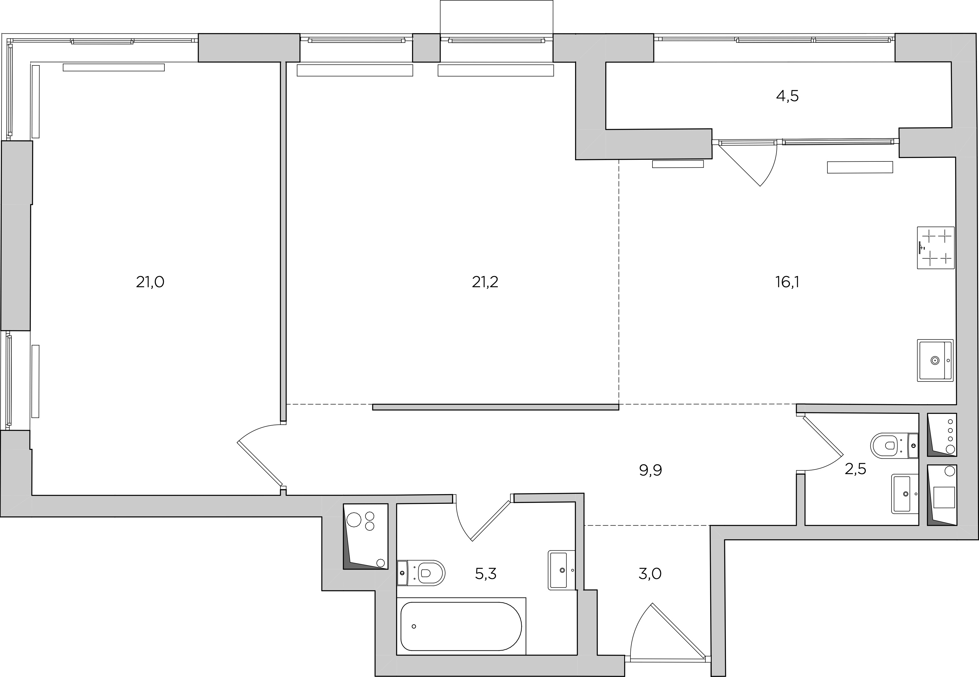 Угловая квартира без несущих стен с двумя санузлами и узкой прихожей |