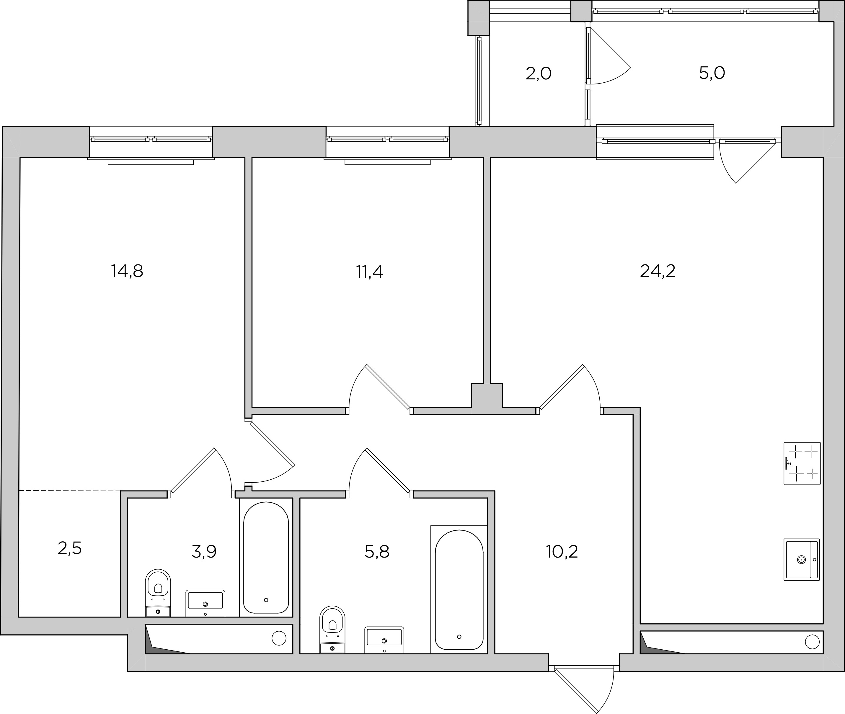 Планировка от застройщика была неплохой, но прихожую и спальни соединял темный коридор, а почти в центре квартиры стояла несущая колонна, которую мы тщательно скрыли. Мы сделали небольшую перепланировку: убрали перегородки между прихожей и кухней-гостиной, сократили коридор, наполнили его естественным светом, и сохранили мастер-спальню, но сделали гардеробную больше.