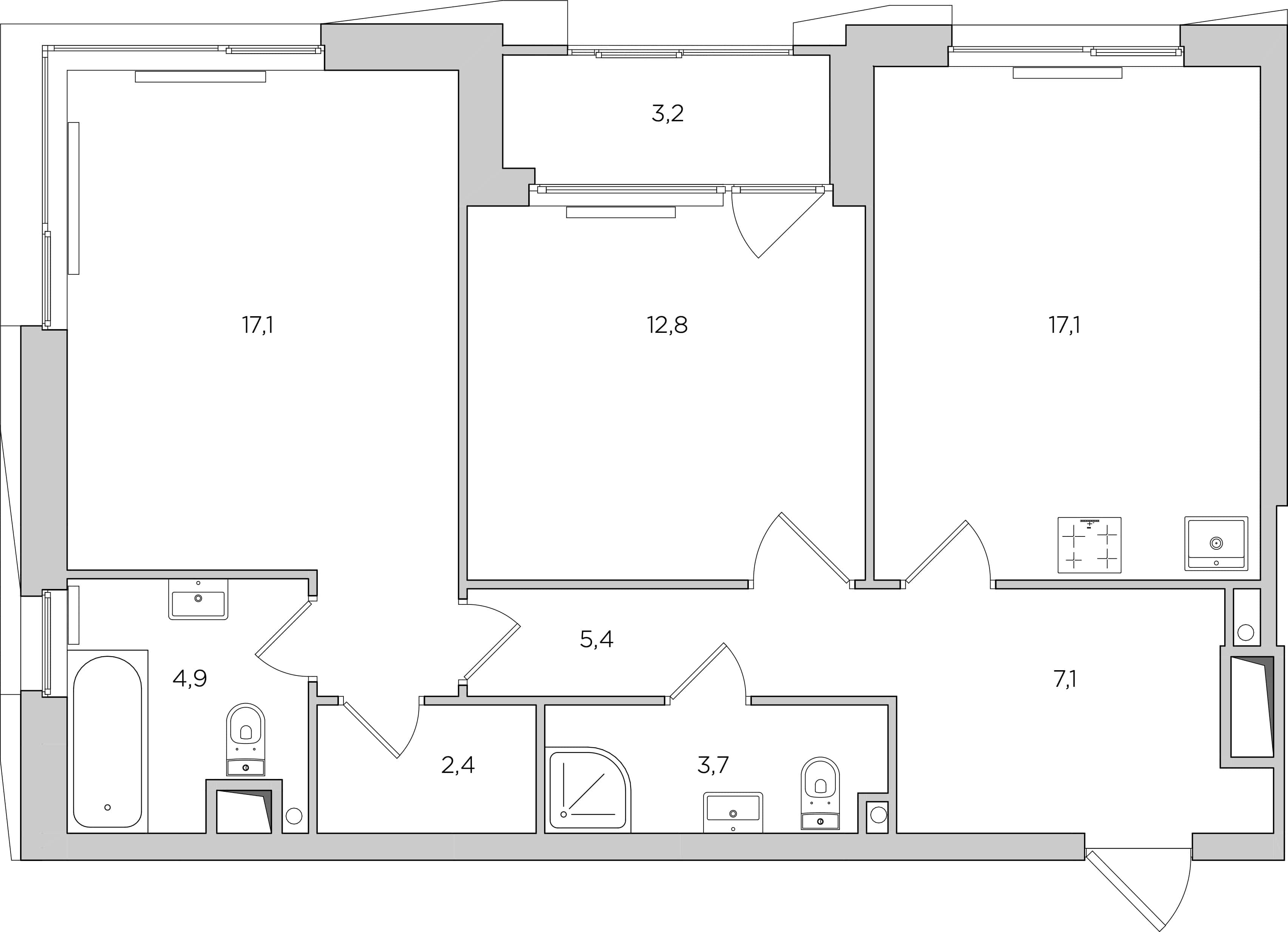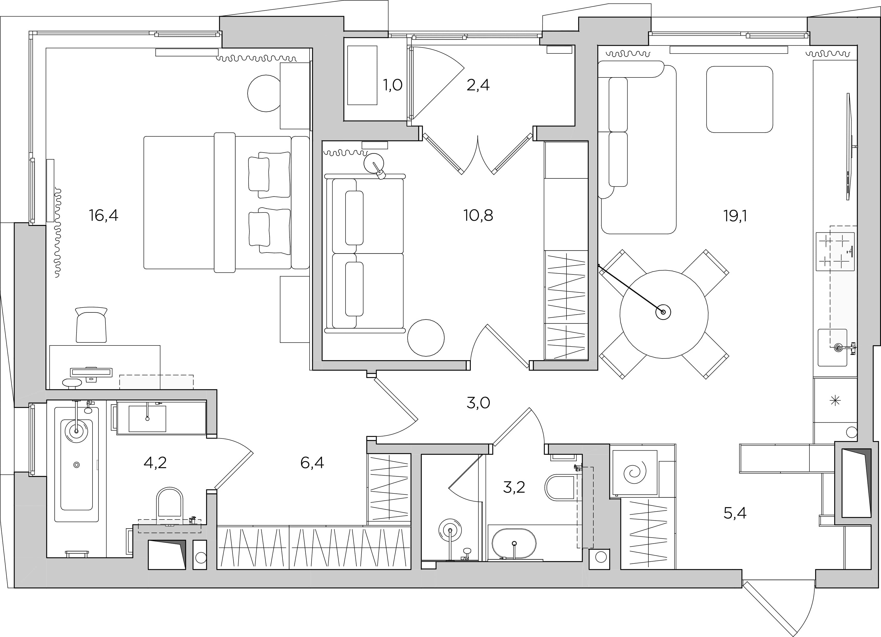 | Особенности | Нет несущих стен, небольшая гардеробная при главной спальне, нет корзины для внешнего блока кондиционера, окно в ванной комнате |